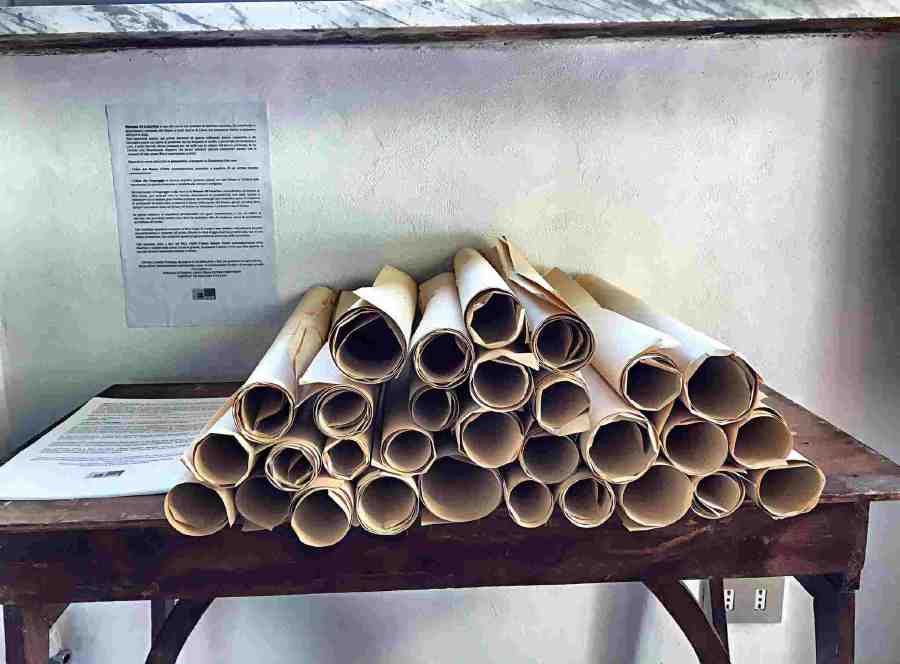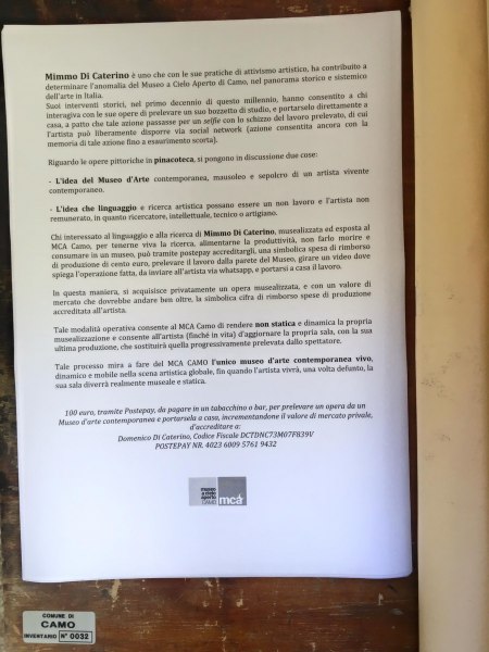 Chi interessato al linguaggio e alla ricerca di Mimmo Di Caterino, musealizzata ed esposta al Camo, per tenerne viva la ricerca, alimentarne la produttività, non farlo morire e consumare in un museo, può tramite postepay accreditargli, una simbolica spesa di rimborso di produzione di cento euro, prelevare il lavoro dalla parete del Museo, girare un video dove spiega l’operazione fatta, da inviare all’artista via whatsapp, e portarsi a casa il lavoro.