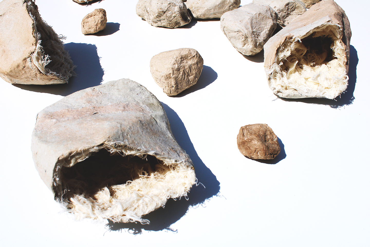 Attraverso questo doppio binario, lecchese e orientale, si muovono i fili che danno forma alla mostra. In un continuo rimando di segni e simboli, il lavoro di Saba Najafi passa dalla cultura locale a quella iraniana come in un intreccio di trama e ordito, fino a formare un tessuto elaborato e omogeneo. Strutturata come un’unica installazione site-specific, la mostra abbraccia le tre navate del piano terra del Museo giocando con gli elementi principali dell’edificio, dispiegando tra gli archi e le pareti sbrecciate dal tempo i motivi cari all’artista. Sono qui esposte infatti rielaborazioni delle ultime serie avviate a partire dal 2020: “Metamorfosi” rami legati tra loro da strisce di tessuto come bende medicali, “Inner care”, pietre parzialmente rivestite di tessuto, e nuove elaborazioni della serie “Stone as memories”, in papier mâché con inserti calligrafici.