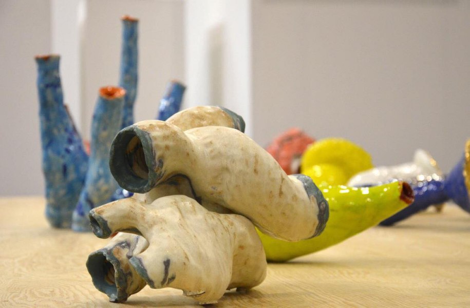 Le forme cave plasmate dall’artista dialogano con i corredi tombali e le testimonianze archeologiche degli antichi Peuceti e interagiscono in modo installativo con la collezione di gessi della vecchia Scuola comunale di disegno conservati nel museo. Caratterizzate da una volumetria morbida e da colori brillanti di gusto pop, le sculture di Sabino de Nichilo somigliano a strutture organiche e possono ricordare a chi li osserva cuori, fegati e stomaci, ma non rispondono ai canoni di un’anatomia ortodossa. “Organi da asporto”, “Carne frolla” e “Anus” – questi i nomi di alcune serie di opere esposte – sembrano ribellarsi al corpo che li potrebbe contenere e crescono liberamente, a loro piacimento, assecondando un impulso vitale alieno, inconsulto, barbaro. Sabino de Nichilo rende nobili gli scarti e le frattaglie e i processi digestivi ai quali allude evocano la società dei consumi nelle forme di una vanitas contemporanea, mescolando ironia e retaggi alchemici.