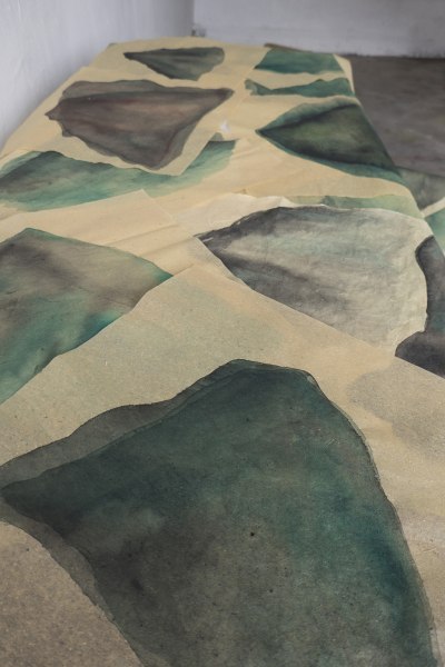 "Si tratta di un progetto realizzato durante una residenza in un piccolo villaggio cinese ai piedi della Grande Muraglia e presentato durante l'Artweek bolognese- spiega la curatrice - che qui si presenta in una nuova veste". Oggetto del lavoro della Muzi è la montagna (Shān in cinese), dipinta ad acquerello su lunghi fogli verticali di carta di riso e su sottili carte cinesi, le cui stratificazioni seriali e le trasparenze restituiscono un luogo di sovrapposizioni temporali e spaziali.