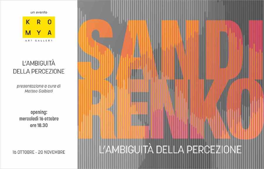 Kromya Art Gallery, mercoledì 16 ottobre alle ore 18.30, inaugura una mostra antologica di Sandi Renko che, dopo il grande successo e riscontro critico avuto dopo la presentazione in anteprima alla Rocca di Umbertide - Centro per l'Arte Contemporanea tenutasi tra lo scorso mese di giugno e il mese di settembre nello storico borgo in provincia di Perugia (Italia), presenta un'ampia e ricca selezione di opere del maestro opere che vanno dagli anni Settanta ad oggi.