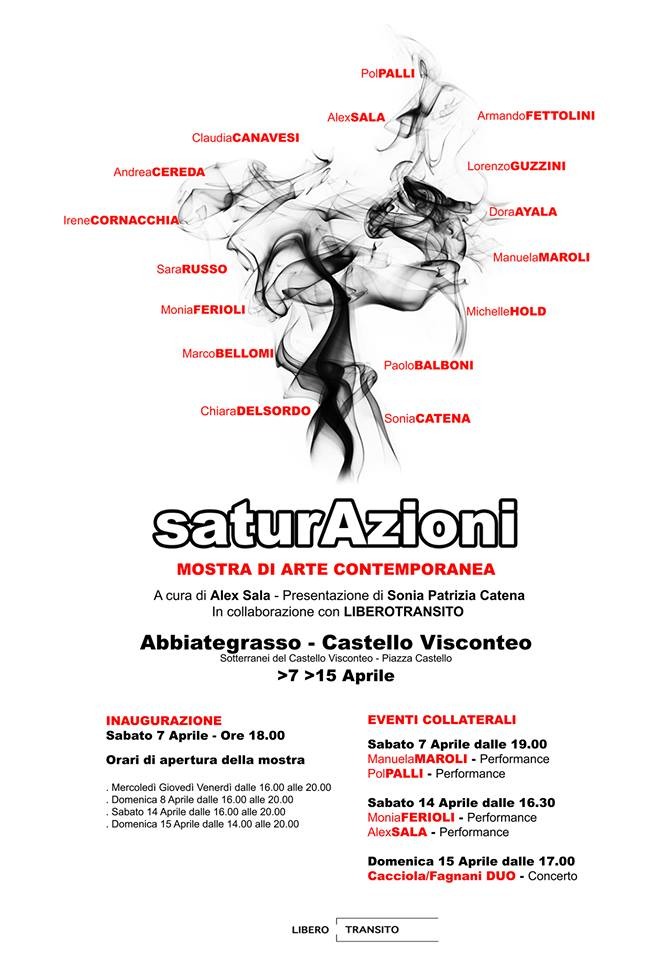 "Saturazioni" si inserisce nelle attività del progetto LIBERO TRANSITO, un collettivo di artisti e curatori uniti da idee simili, ma ognuno diverso nella sua personale ricerca. Il gruppo, nato da un'idea di Alex Sala nel 2012, non ha una sede fisica, ma è un non-luogo dove sperimentare rinnovate forme di condivisione, proporre progetti e mostre. Gli artisti del collettivo abitano in luoghi distanti fra loro e la loro piazza di dialogo è quella virtuale: un gruppo privato su facebook. Cambiano continuamente e sono liberi di aggregarsi per una mostra se il tema proposto è in sintonia con il loro percorso. Un cammino che si fa insieme o che può interrompersi in qualsiasi momento, perché l'importante è sentirsi parte di un'unica invisibile connessione.
