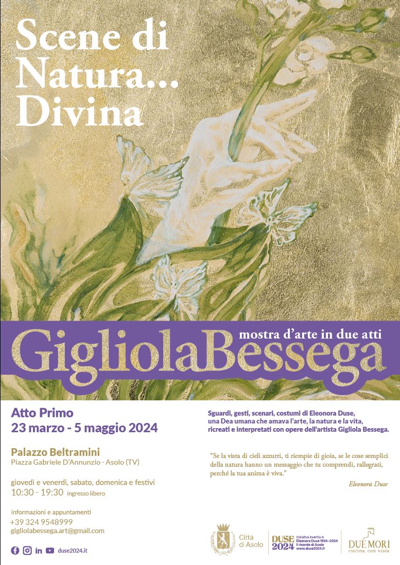 Dal 23 marzo al 5 maggio 2024, presso la Sala Beltramini del Municipio di Asolo, si terrà il primo atto della mostra “Scene di Natura…Divina”, dell’artista padovana Gigliola Bessega. La mostra, a cura di Angela Forin, è stata selezionata tra le iniziative correlate di Duse2024, il ricco calendario di eventi che Asolo dedica a Eleonora Duse per le celebrazioni del centenario dalla sua scomparsa. Il secondo atto della mostra si terrà dal 14 settembre al 27 ottobre 2024.