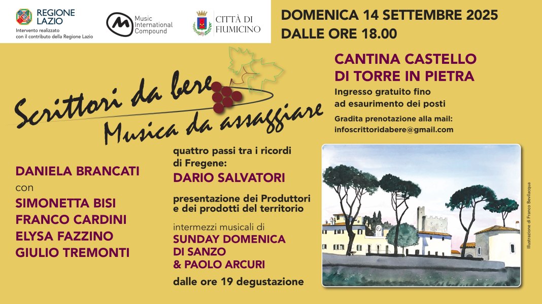 Torna, domenica 14 settembre alle ore 18:00, “Scrittoridabere e Musicadassaggiare” un percorso di letteratura, musica ed eccellenze enogastronomiche che approda nell’antica cantina del Castello di Torre in Pietra, Piazza Torre in Pietra 247, nel comune di Fiumicino.
