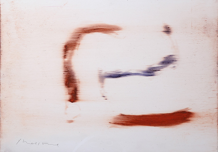 La ricerca sul senso e sulle possibilità del segno – ora come immagine, ora come parola – che definisce l’opera dell’artista bolognese, lo porta volontariamente vicino anche all’idea di sublimazione: dal latino sublimis, sublimare viene inteso nel senso più puro del termine, come un qualcosa che innalza, che “orienta verso un punto di fuga nell’infinito, all’indeterminato’’, proprio come le opere presentate, sospese e dall’intento quasi magico. Così come la cancellazione, sublimare è un atto che implica una perdita, una relativa interiorizzazione ed elaborazione, ed infine la creazione di qualcosa di nuovo che si possa porre sia come soluzione, sia come nuovo punto di domanda. In ciò rivediamo l’utilizzo di Caccioni di mezzi antichi come la pittura ad olio e le velature, che vengono però completamente reinventati da tecniche come la cancellazione; oppure l’utilizzo di materiali insoliti come l’alluminio, superficie reattiva adoperata a partire dal 2019. Caccioni in tal senso si avvicina all’idea concettuale di sublimazione spogliandosi di canoni, tecniche, spazi e tempi convenzionali per lasciarsi guidare, in questo caso nella notte, verso nuovi linguaggi e codici atti a reinventare la pratica della pittura nella contemporaneità.
