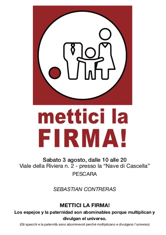 Sabato 3 agosto, dalle ore 10 alle 20 Viale della Riviera n. 2 - presso la “Nave di Cascella” PESCARA SEBASTIÁN CONTRERAS METTICI LA FIRMA! Los espejos y la paternidad son abominables porque multiplican y divulgan el universo (Gli specchi e la paternità sono abominevoli perché moltiplicano e divulgano l’universo) Azione artistica per l’abrogazione del reato di parricidio dal Codice Penale italiano Mettici la Firma! è il titolo dell’azione dell'artista Sebastián Contreras che si svilupperà durante il corso dell’intera giornata di sabato 3 agosto, dalle ore 10 alle 20, su Viale della Riviera n.2 di Pescara presso la “Nave di Cascella”. A metà tra performance e attività politica, l’azione di arte relazionale coinvolgerà i passanti ignari in un immaginario referendum per l’abrogazione del reato di parricidio dal Codice Penale italiano. L’azione emulerà la tradizionale raccolta firme sotto un gazebo e i firmatari riceveranno un attestato firmato, numerato e timbrato dall’artista. Accompagnerà l’azione il testo critico di Miriam Di Francesco e una serie di manifesti, depliant, cartelli, timbri e gadget (magliette, pins, stickers). Il sottotitolo è preso in prestito da una frase del primo racconto del libro dello scrittore argentino Jorge Luis Borges, Ficciones (Finzioni). Nel racconto Tlon, Uqbar, Orbis Tertius, Borges e il suo amico Bioy Casares, come protagonisti in prima persona, trovano uno specchio in fondo al corridoio di una grande villa affittata, fuori da Buenos Aires. Il ritrovamento scatenerà una lunga conversazione fra loro a proposito di mondi fantastici e luoghi immaginari citati in un’enciclopedia antica, dove scopriranno che gli specchi hanno una componente mostruosa e che l’universo è un’illusione. I mondi fantastici ed eruditi di Borges diventano per l’artista l’ispirazione per una “messa in scena” che, seppur inventata, risponde ai criteri di verosimiglianza. I cittadini saranno chiamati a partecipare all’azione firmando una serie di finte clausole normative per la depenalizzazione del reato di parricidio che puntano i riflettori sull’attuale società patriarcale. La ricerca di Contreras si dirige verso l’interazione e l’incontro tra persone congiunta all’immaterialità dell’oggetto artistico in controtendenza all’aspetto consumistico capitalista. BIO: Sebastián Contreras nasce a Buenos Aires nel 1972. Attualmente vive e lavora tra Pescara e Buenos Aires. In Argentina segue corsi di disegno e pittura presso il Centro Cultural Rojas, fotografia presso il FotoClub e scultura su pietra presso l'Academia de Bellas Artes di Buenos Aires. Nel 2001 lascia la carriera di veterinaria dopo anni di studio all'Universidad de Buenos Aires per trasferirsi in Italia e laurearsi in Dams Arte all'Università di Bologna. Il suo lavoro include scultura, video, installazioni, pittura, performance. La sua poetica gravita intorno ai temi legati all’esistenza, la sessualità e l’animo umano tramite l’astrazione formale. UFFICIO STAMPA RP/Press Contatti: Marcella Russo - M. +39 349 3999037 www.rp-press.it | E. press@rp-press.it SCHEDA TECNICA Artista: Sebastián Contreras Titolo: Mettici la firma! Luogo: Viale della Riviera n. 2 - presso la “Nave di Cascella” (PE) Data: Sabato 3 agosto, dalle ore 10 alle 20 Testo critico: Miriam Di Francesco Graphic design: Giorgia Mascitti Ufficio stampa: www.rp-press.it Info: https://www.instagram.com/sebastiancontrerasart/