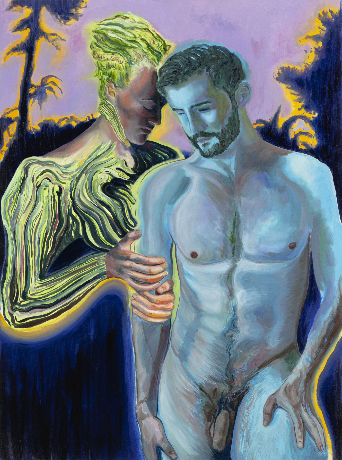 Bongiovanni, con la sua pittura “liquida”, ispirata dal pensiero dello scrittore Bauman, e i suoi disegni, che richiamano l’antico ma mantengono un distacco da tale contesto, cerca un punto di congiunzione tra naturale e artificiale, comico e tragico, passato e presente. Un passato che non si conosce fino in fondo ed un presente che cerca di catturarlo. Un presente senza etichette, a volte fuori registro, oltre ogni tipo di classificazione per sottolineare la propria libertà di espressione. Attraverso la sua pittura ad olio cerca di cogliere qualsiasi elemento, non sposando un solo stile. Inizialmente concentra la sua ricerca pittorica sui volatili, elemento molto riconoscibile nelle sue prime opere. La sua produzione poi muta ed evolve, ispirato, oltre che dal passato, da autori contemporanei che toccano tematiche come quelle del queer, spinto da un desiderio e una necessità di volere parlare di altro, di determinate condizioni sessuali, di determinati stati d’animo, di un certo malessere, isteria, e falsa gioia, di un narcisismo tragicomico. “Anche la robotica, gli androidi mi affascinano. Mi piace immaginare potenziali personaggi e corpi del futuro. Anche il tema della violenza ha una parte fondamentale nel mio lavoro, che poi si scontra con la componente buffa, con quella melanconica o con quella ironica”. Nei suoi lavori rappresenta un mondo fatto da personaggi dall’identità ambigua, non uomini e nemmeno donne, malinconici e distaccati ma in cerca di un dialogo aperto con lo spettatore, elaborati da disegni digitali, trasposti pittoricamente con pennellate morbide e fluide, e con colori dalle tonalità intense e graduate.