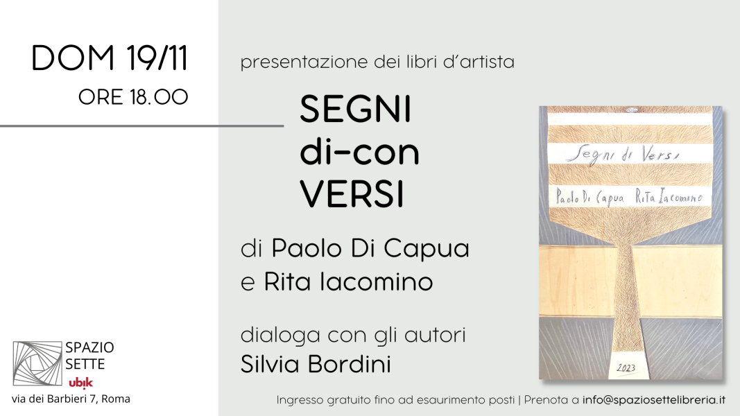 Sabato 19 novembre, dalle ore 18.00, la Libreria Spazio Sette di Roma ospiterà la presentazione di due libri d’artista, nati dalla “collaborazione verbo-visiva” instauratasi tra l’artista Paolo Di Capua e la poetessa Rita Iacomino.