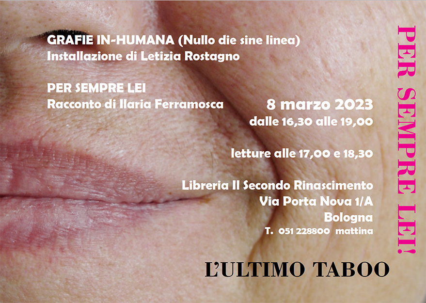Viene proposta un’installazione, 14 fotografie di piccolo formato, inserite in cornici di dimensione “domestica” (25 x 25 da tavolo) sparse tra scaffali e libri. Il titolo “Grafie in-humana (nullo die sine linea)” suggerisce con termini quali Grafie e Linea possibili percorsi di senso, ma certo non lascia trapelare che i segni e le linee di cui si tratta sono le rughe dell’artista, messe in bella mostra e in cornice quasi nel salotto di casa. Tante le suggestioni e i possibili percorsi di senso suggeriti sia dalla collocazione (tra i libri, in un luogo di cultura) che dalla modalità di presentazione che dal soggetto in sé. Ulteriore motivo di riflessione verrà dato dal racconto che Ilaria Ferramosca ha scritto appositamente lasciandosi ispirare dalle immagini di Rostagno e che verrà letto al pubblico. Una piccola chicca che, insieme alle immagini esposte, propone un pensiero divergente, un’altra prospettiva, una diversa presa di coscienza delle donne.