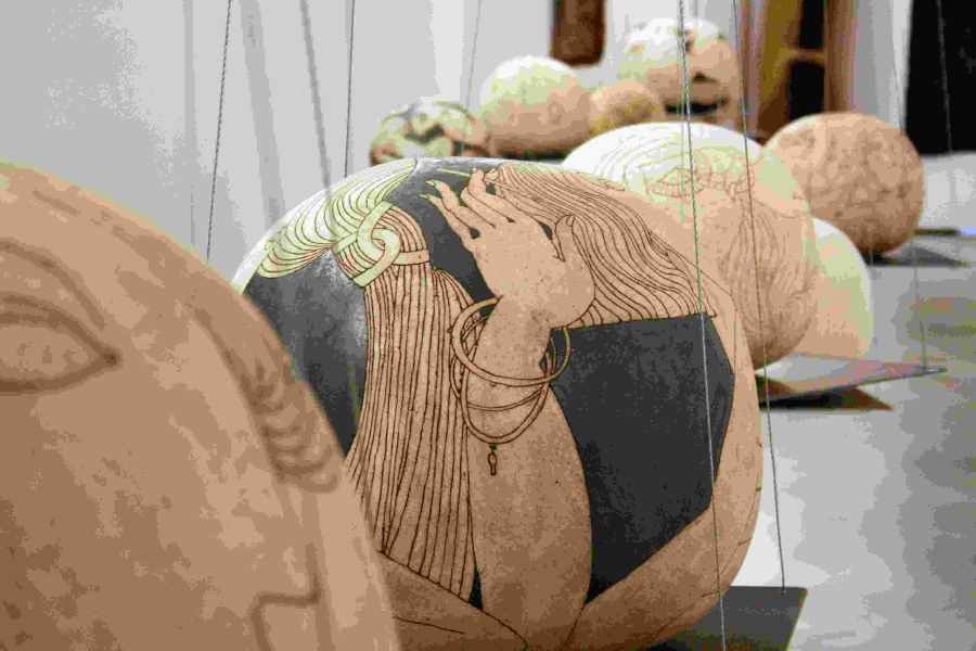 In mostra le grandi sfere in ceramica dell’artista armena, sulle quali si avvicendano da ogni lato i dipinti dei flessuosi corpi umani, per la maggior parte femminili, che caratterizzano l’elemento fondante delle sue sculture.