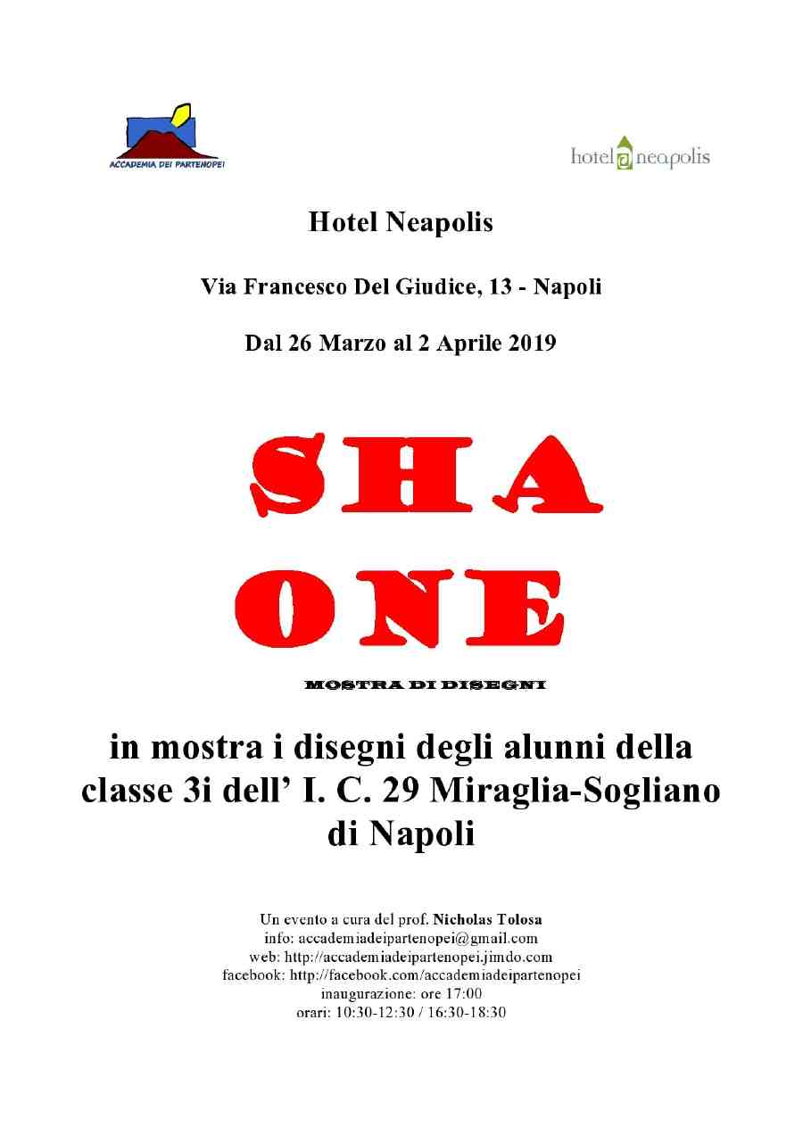 Martedì 26 Marzo 2019, presso l’ Hotel Neapolis, a Napoli, in via Francesco Del Giudice 13, si inaugura alle 17,00 una mostra di disegni degli alunni della classe 3i dell’ Istituto Comprensivo 29 Miraglia-Sogliano di Napoli curata dal prof. Nicholas Tolosa, intitolata: “Sha One”.