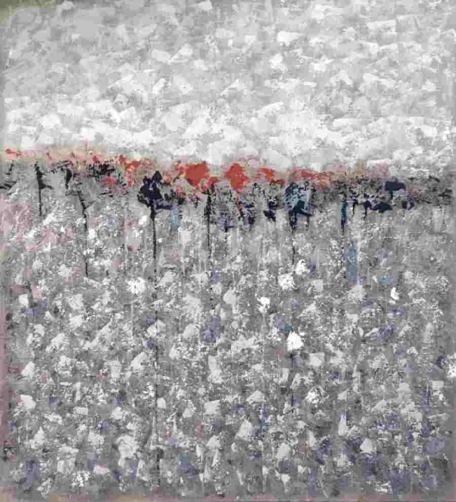 La terra e l’acqua son gli elementi essenziali per dare inizio alla vita, e la ricerca della vita si esprime anche attraverso le vibrazioni cromatiche: i colori come fossero vivi, scivolano sulla tela, creando distese marine e laghi ghiacciati, campiture granulose che richiamano terre argillose sulle sponde dei fiumi.