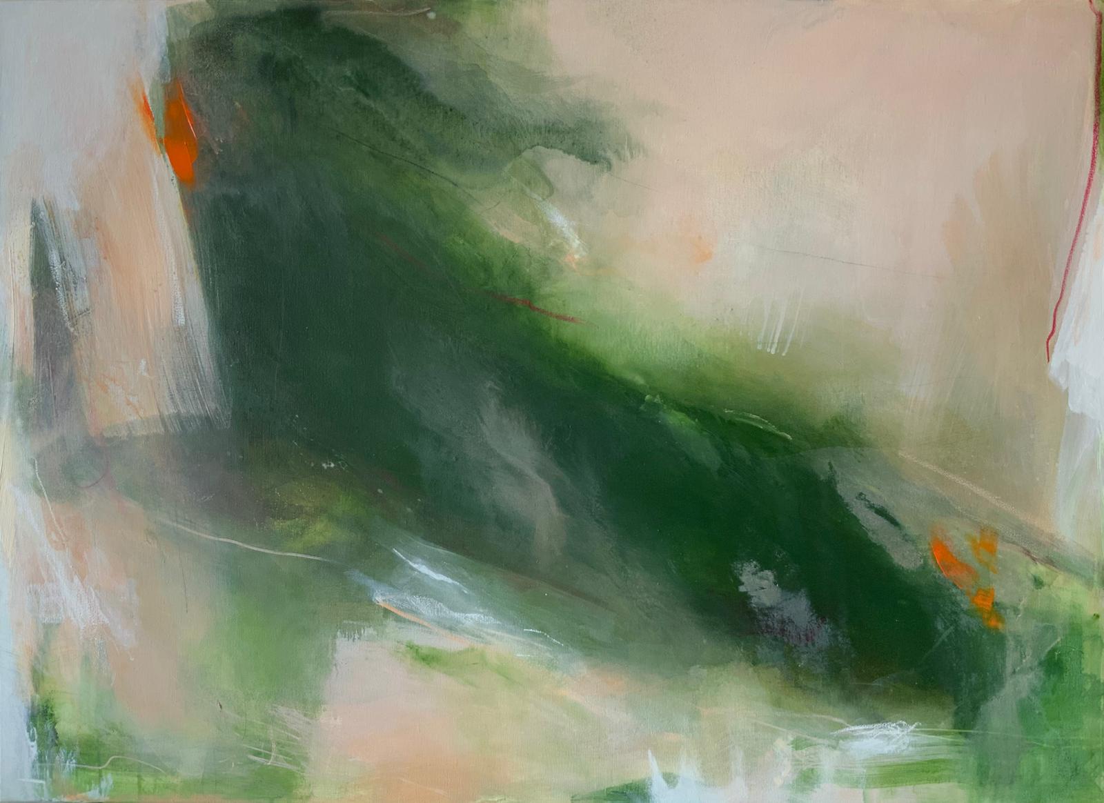 Il racconto pittorico diventa così un viaggio liberatorio, un ritorno al lato più silvestre, selvatico e primigenio dell’essere. Il verde, colore dominante, assume il valore di simbolo rigenerativo: è la speranza, la visione di un futuro aperto, la possibilità di trasformazione. Come afferma l’artista, “le limitazioni mentali vengono superate e si apre lo spazio per un’esplorazione delle libertà personali”. Le improvvise accensioni d’arancio che punteggiano la superficie delle opere agiscono come scintille vitali, piccoli fuochi interiori che interrompono la quiete della natura circostante. Sono segni di passione e di rinnovamento, impulsi emotivi che animano la serenità del verde e ne amplificano la forza simbolica.