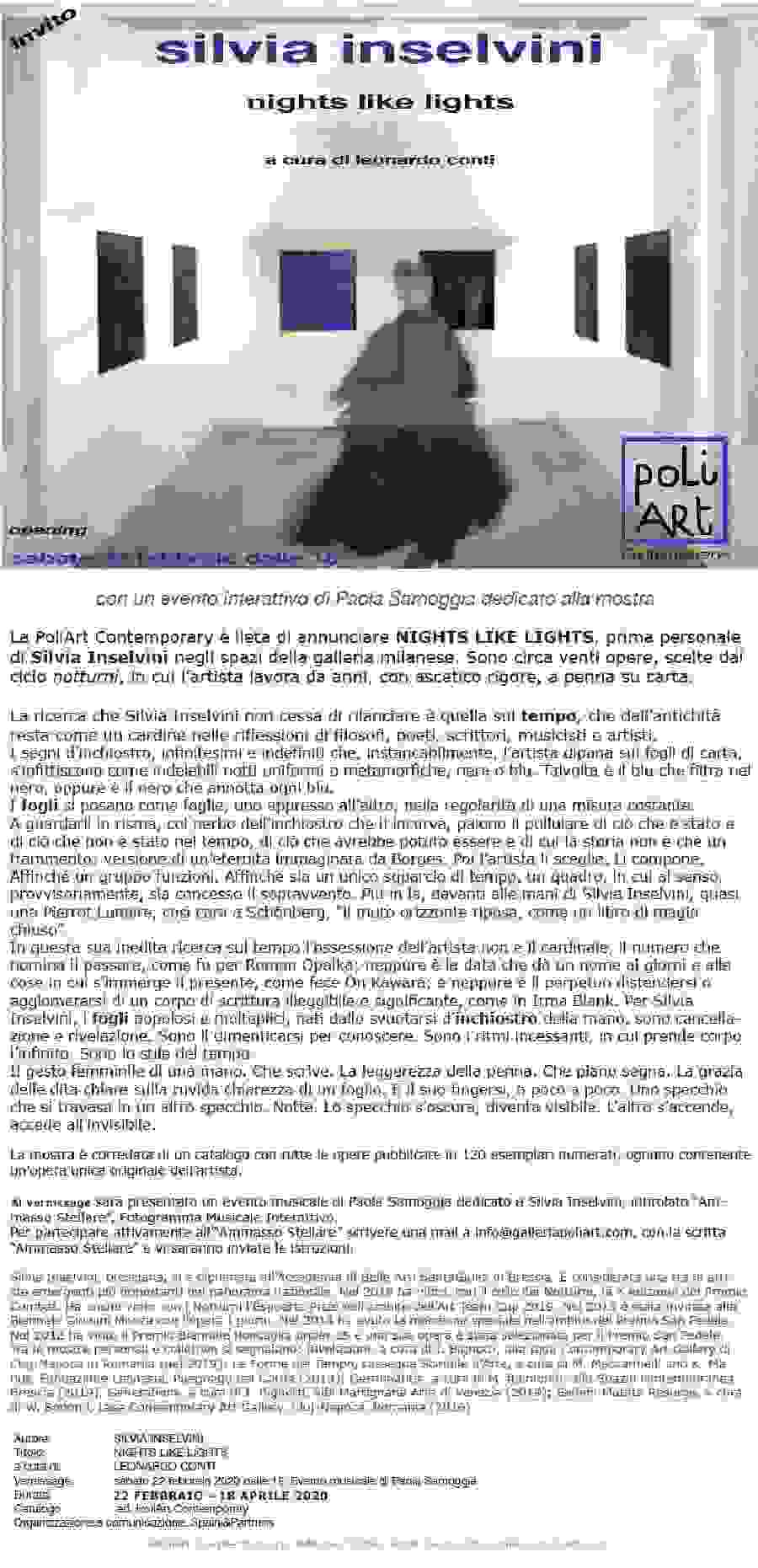 La PoliArt Contemporaryè lieta di annunciare NIGHTS LIKE LIGHTS (notturni), prima personale di Silvia Inselvini negli spazi della galleria milanese. Sono circa venti opere, scelte dal ciclo notturni,in cui l’artista lavora da anni, con ascetico rigore, a penna su carta. La ricerca che Silvia Inselvini non cessa di rilanciare è quella sul tempo, che dall’antichità resta come un cardine nelle riflessioni di filosofi, poeti, scrittori, musicisti e artisti.