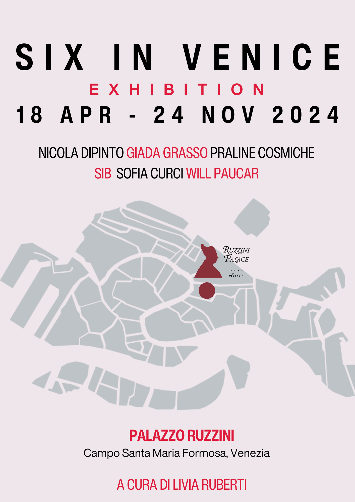 Nei lussuosi spazi di Palazzo Ruzzini a Venezia sarà esposta la mostra SIX in Venice, a cura di Livia Ruberti, dal 18 aprile al 24 novembre 2024, in concomitanza con la sessantesima Esposizione Internazionale d'Arte della Biennale.Il gruppo di artisti ultra contemporanei composto da Giada Grasso, Praline Cosmiche, Nicola Dipinto, SIB sketchinkbook, Sofia Curci e Will Paucar, dopo la mostra collettiva Six, curata da Livia Ruberti e tenutasi lo scorso dicembre nella Galleria San Babila di Milano, prosegue la ricerca artistica ed estetica definendo nuove prospettive dell'identità personale.