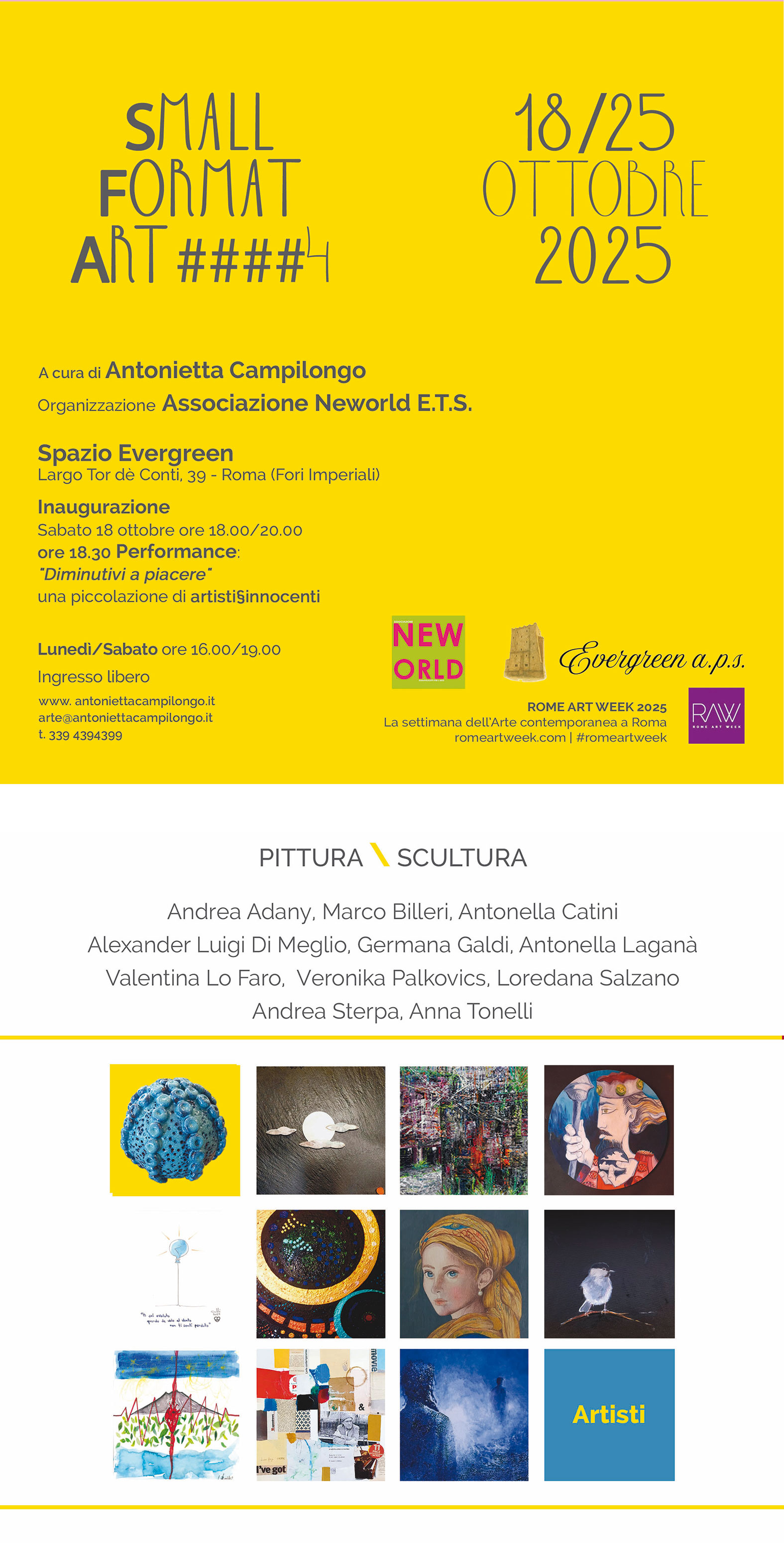 Sabato 18 ottobre alle ore 18.00 e fino alle 20.00 si inaugura, presso Spazio Evergreen – Largo Tor de’ Conti, 39 – Roma, la mostra dal titolo: Small Format Art ###4. L’evento è a cura di Antonietta Campilongo con l’organizzazione dell’Associazione Neworld E.T.S, nell’ambito della rassegna Rome Art Week 2025