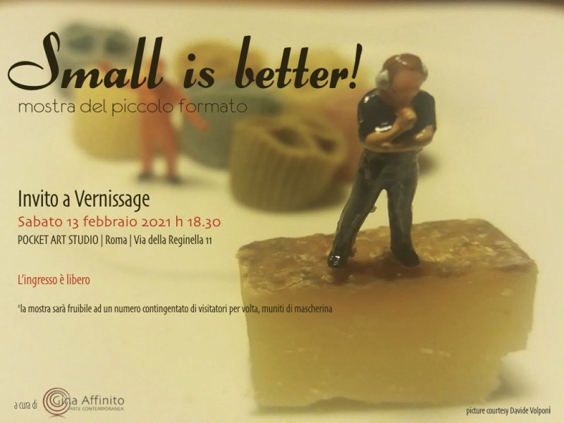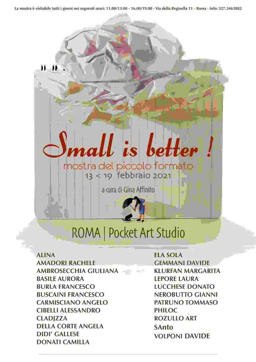 Small is Better! = Piccolo è Meglio! si propone di presentare, attraverso una mostra espositiva, opere d’arte di piccolo formato per vivere da vicino la vivacità, l’espressione e la bellezza dell’arte, anche quella di dimensioni contenute; dimensioni che accentuano una funzionale occasione di scambio, veloce e dinamico, tra l’arte del nostro tempo e il suo pubblico.