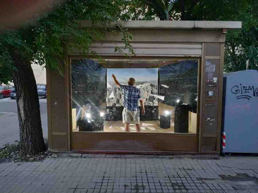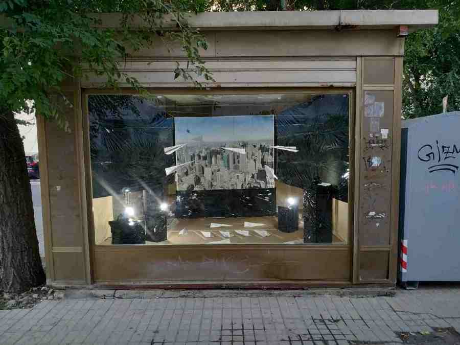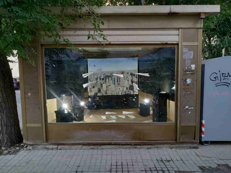 L'interno dell'ex Chiosco Mondadori è stato rivestito per l'occasione con carta d'imballaggio, al centro della vetrina New York, con degli aerei di carta che volteggiano su di lei, immagine evocativa, rimanda all'undici Settembre 2001 e al crollo delle twin tower's, gli arei di carta vanno oltre il ludico gioco di un bambino e metaforicamente si accostano alla fragilità di vite sequestrate in volo, alcuni arei sono a terra, non sappiamo se pronti a spiccare il volo o fermi in stato d'allerta, in attesa del da farsi.