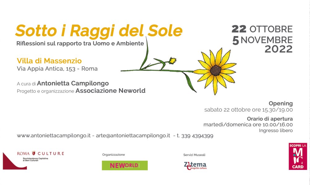 A seguito del successo della mostra Ghê Gaia Terra, svoltasi lo scorso mese di aprile presso il Museo delle Mura, un nuovo progetto espositivo, Sotto i Raggi del Sole. Riflessioni sul rapporto tra Uomo e Ambiente, dedicato anch’esso al tema del futuro del pianeta e alla necessità di costruire un nuovo rapporto Uomo/Natura, viene ospitato presso la Villa di Massenzio e il Mausoleo di Romolo.