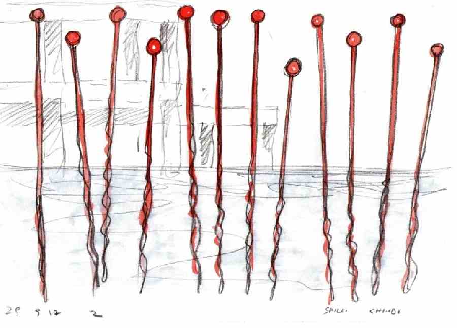 Gli spilli assumono anche la funzione di indicatori che segnalano ed indicano una realtà in mutazione proprio nell’acqua del nuovo lago: nell’acqua che è sinonimo di vita, di cultura e di civiltà, nell’acqua che comincerà a scarseggiare se il clima non fermerà la sua corsa eversiva.