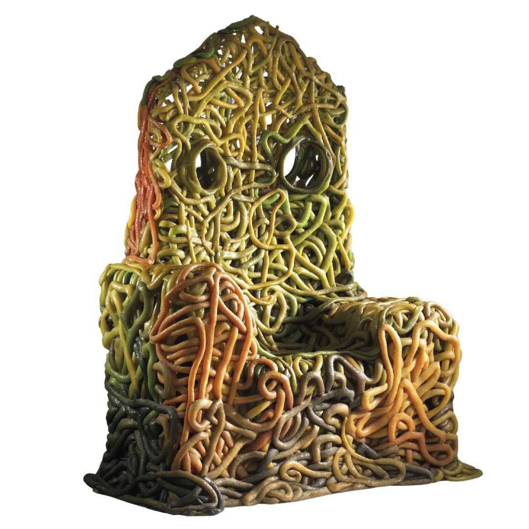 Non passano inosservate, poi, le creazioni fuori scala di Gaetano Pesce Trono Modello Senza Fine Unica in PVC policromo nei toni del verde, beige e rosso e Trono Modello Senza Fine in poliuretano estruso nei toni del nero – veri e propri pezzi unici che fanno della matericità la loro struttura.