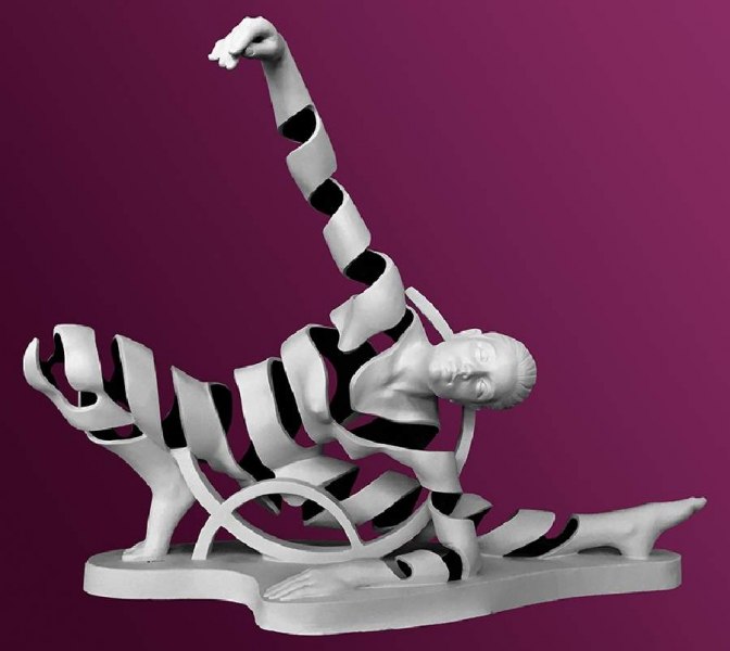 Mentre “Oltre” in bronzo è creata con un’originale lega metallica che amalgama al bronzo una parte di acciaio e di argento; la visione d’insieme crea un effetto futurista. Suggestiva la visione di quest’opera che ci trasporta nell’immaginario collettivo del desiderio di volare: sorretta da tre semplici tubi di acciaio, con lo stesso che a terra ne disegna l’ombra, sembra spiccare il volo in uno spazio senza limiti. La materia si disgrega per poi ricomparire modellata nella forma desiderata dall’artista, perseguendo Il mondo dei sogni, delle idee che racchiudono la potenzialità che tutto sia possibile, realizzabile!