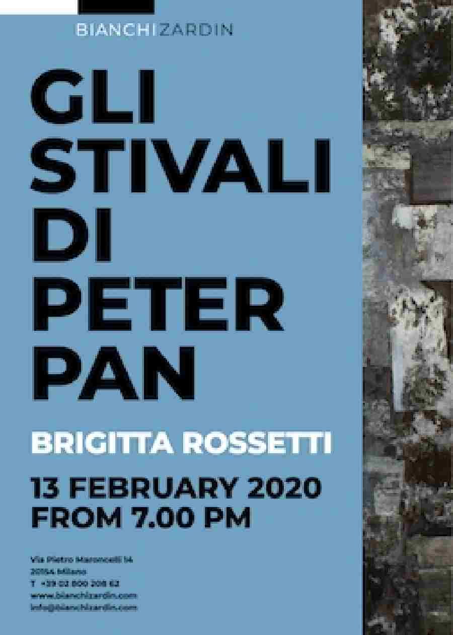 Come primo progetto espositivo viene presentata la personale di Brigitta Rossetti, che fa dell’osservazione del mondo e della relazione tra parole e immagini uno dei tratti principali della sua poetica. L’artista, che indaga lo spazio in relazione allo spettatore e si esprime attraverso la contaminazione dei media, presenta in mostra opere di diversa tipologia: pitture figurative, astratte, installazioni e opere in cui si mescolano più tecniche, una sorta di ready-made per riflettere sul concetto di incrocio, di mescolanza, di quella commistione che porta alla trasformazione. “Gli stivali di Peter Pan”, l’istallazione realizzata con materiali di riuso che dà il titolo alla personale, rappresenta un invito ai visitatori a compiere un viaggio sconosciuto, alla ricerca della propria identità. La meta è l’isola che non c’è, emblema di un luogo metafisico anziché fisico, di quello spazio introspettivo e introiettivo presente in ognuno di noi e a cui è necessario accedere per comprendere chi siamo, cosa desideriamo e dove stiamo andando.