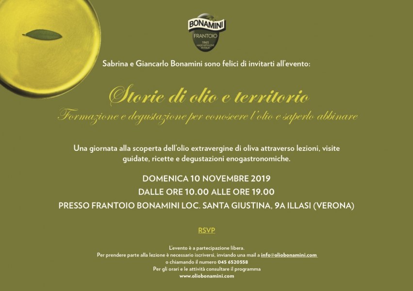 Si svolgerà domenica 10 novembre dalle ore 10 alle ore 19 “Storie di olio e territorio. Formazione e degustazione per conoscere l’olio e saperlo abbinare”, nuovo appuntamento con Frantoio Bonamini. Una giornata che si terrà proprio presso il frantoio di Illasi, alla scoperta dell’olio extravergine di oliva attraverso lezioni, visite guidate, ricette e degustazioni enogastronomiche.