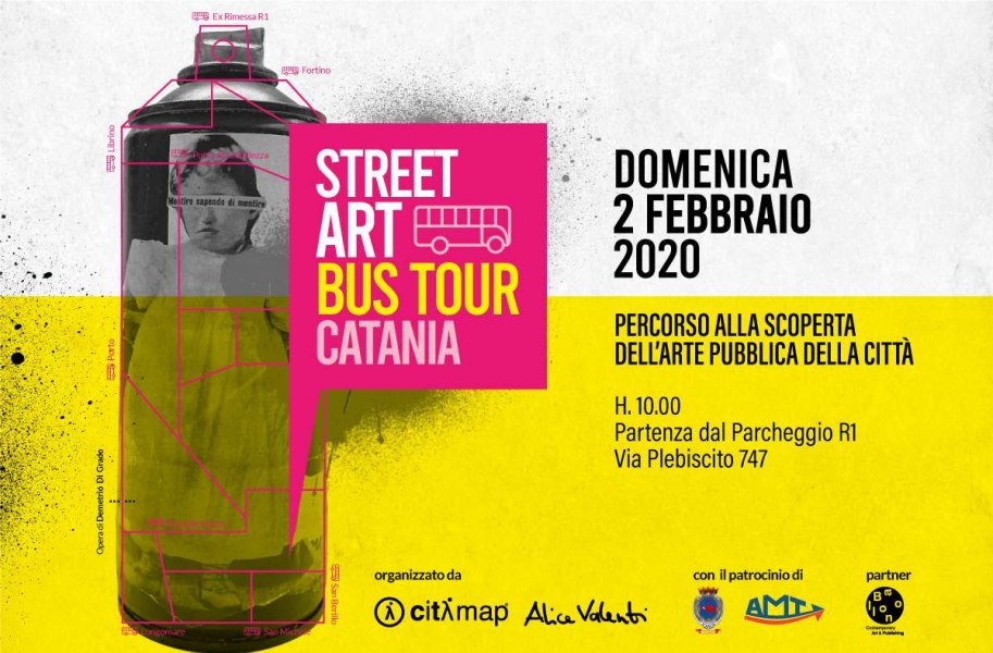 CityMap Sicilia, mappa della città Catania, attiva da più di dieci anni sul territorio con progetti on e off line volti a far conoscere e promuovere il territorio e Alice Valenti, detta anche “l’artista guerriera” per i soggetti dei suoi lavori e per le numerose campagne sociali che porta avanti - in occasione della 15esima edizione della Giornata del Contemporaneo 2019, promossa da AMACI - hanno organizzato lo “Street Art Bus Tour #Catania”, un percorso alla scoperta di alcuni tra i più importanti interventi d’arte pubblica della città.