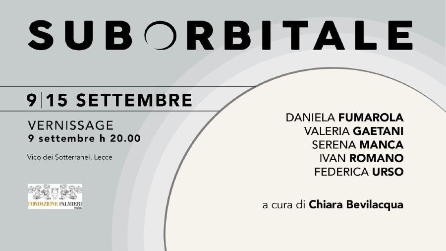 Domenica 9 Settembre alle h 20.00, la Fondazione Palmieri, in Vico dei Sotterranei a Lecce, inaugura SUBORBITALE, collettiva d’Arte Contemporanea con le opere di Daniela Fumarola, Valeria Gaetani, Serena Manca, Ivan Romano, Federica Urso a cura di Chiara Bevilacqua.