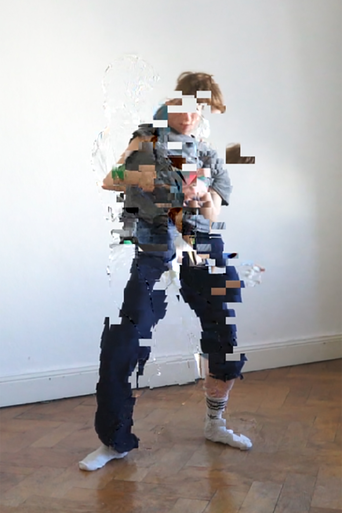 Una lotta continua con la tecnologia: il corpo si muove in modo più o meno fluido, perlustra il pavimento e guarda nella telecamera che meccanicamente e passivamente riprende. Ecco che per un attimo il meccanismo si inceppa e sullo schermo il corpo appare pixelato, sgranato. Un errore. Erika esegue subito uno screenshot della sua immagine che sullo schermo sta per sparire. Un corpo che temporaneamente occupa quella stanza, che appare e scompare a intermittenza.
