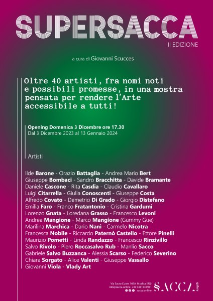 Domenica 3 dicembre alle ore 17.30 verrà inaugurata a Modica la seconda edizione della mostra SUPERSACCA. Il titolo del progetto, lanciato per la prima volta tre anni fa da Giovanni Scucces, lega il carattere “eccezionale” dell’iniziativa al nome della sua galleria d’arte (SACCA, appunto), per l’occasione in versione extralarge! Infatti, saranno oltre 40 gli artisti presenti in mostra con una o più opere.