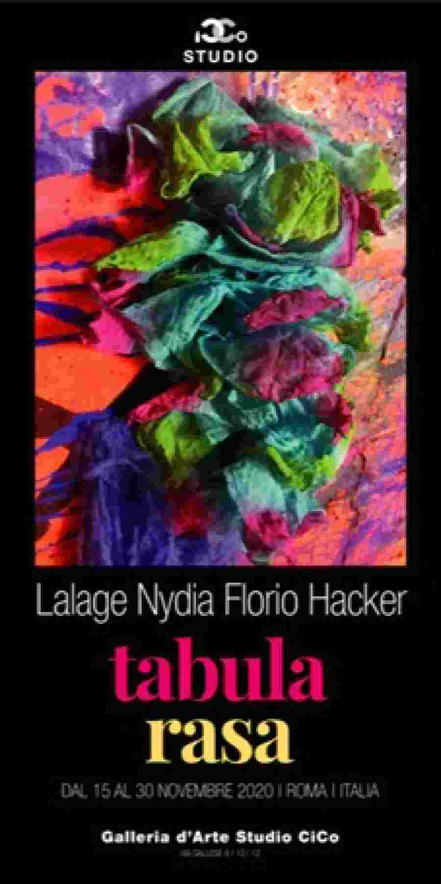 Domenica 15 novembre fino al 30 novembre la Galleria Studio CiCo presenta la mostra curata da Cinzia Cotellessa “Tabula Rasa”: personale dell’Artista Lalage Nydia Florio Hacker, che esporrà opere di varie dimensioni: dal piccolissimo al gradissimo (...ma formato da molteplici piccolissimi), fino agli arazzi: una moltitudine di dimensioni e colori che si fondono in una suggestiva "miscelanza" cromatica.
