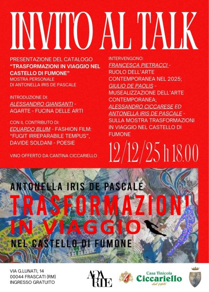 Con l’introduzione di Alessandro Giansanti, il contributo di Eduardo Blum (fashion film: “Fugit Irreparabile Tempus”), le poesie di Davide Soldani, l’intervento di Francesca Pietracci (sul ruolo dell’arte contemporanea nel 2025), il contributo di Giulio De Paolis (sulla musealizzazione dell’arte contemporanea) e Alessandro Ciccarese ed Antonella Iris De Pascale (sulla mostra trasformazioni in viaggio nel Castello di Fumone). Durante la presentazione si potrà degustare il vino offerto dalla Cantina Ciccariello.