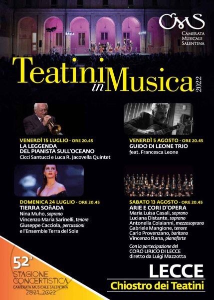 Prende il via il prossimo 15 luglio nel Chiostro dei Teatini di Lecce l'edizione 2022 della rassegna “Teatini in Musica” della Camerata Musicale Salentina, la storica associazione fondata dal M° Carlo Vitale nel 1970. Quattro eventi tra luglio e agosto realizzati in collaborazione con il Comune di Lecce e con il contributo del Ministero della Cultura e della Regione Puglia. Sponsor della manifestazione è come sempre Banca Popolare Pugliese.