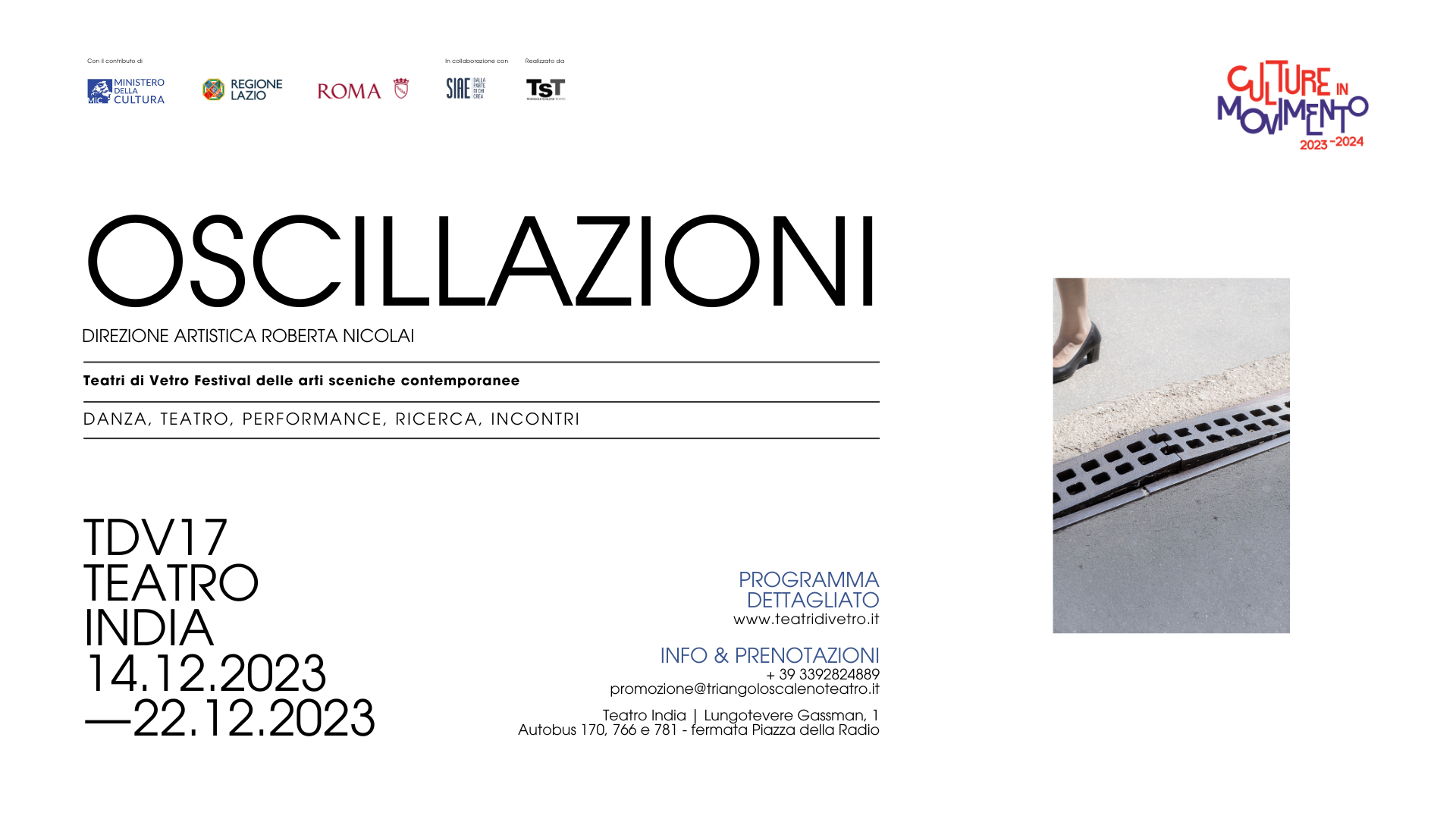 Composizioni, il 10 e il 13 dicembre al Teatro del Lido di Ostia, propone interventi artistici partecipativi con gli spettacoli di Daria Greco, Michael Incarbone e Erica Bravini, Bartolini/Baronio, Simona Bertozzi; Oscillazioni, dal 14 al 22 dicembre al Teatro India intercetta le spinte più significative della produzione artistica contemporanea di ricerca presentando in prima nazionale e romana i lavori degli artisti della scena nazionale tra cui Alessandra Cristiani, Chiara Frigo, Paola Bianchi, Opera Bianco, Roberto Corradino, Fanny & Alexander, Menoventi Michael Incarbone e Erica Bravini, Bartolini/Baronio, Simona Bertozzi, Lucia Guarino e Ilenia Romano, Cie MF. Elettrosuoni, è l’anima musicale del festival, dal 18 al 22 dicembre al Teatro India.