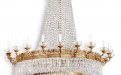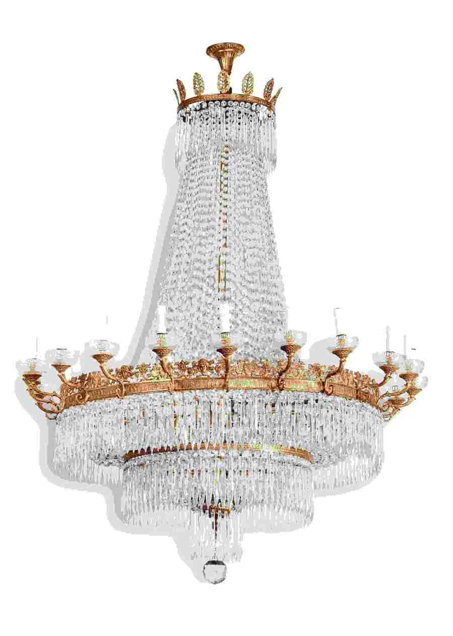 Tra i lotti di questa vendita segnaliamo un LAMPADARIO in stile Impero in lamina di metallo dorato decorato con un fregio continuo a mascheroni, cornucopie, cigni e vasi che poggia su una fascia cesellata a palmette dalla quale partono i venti bracci con bobeches in cristallo così come le collane e i pendenti dei due palchi, la stima è 1.500/2.500 euro.