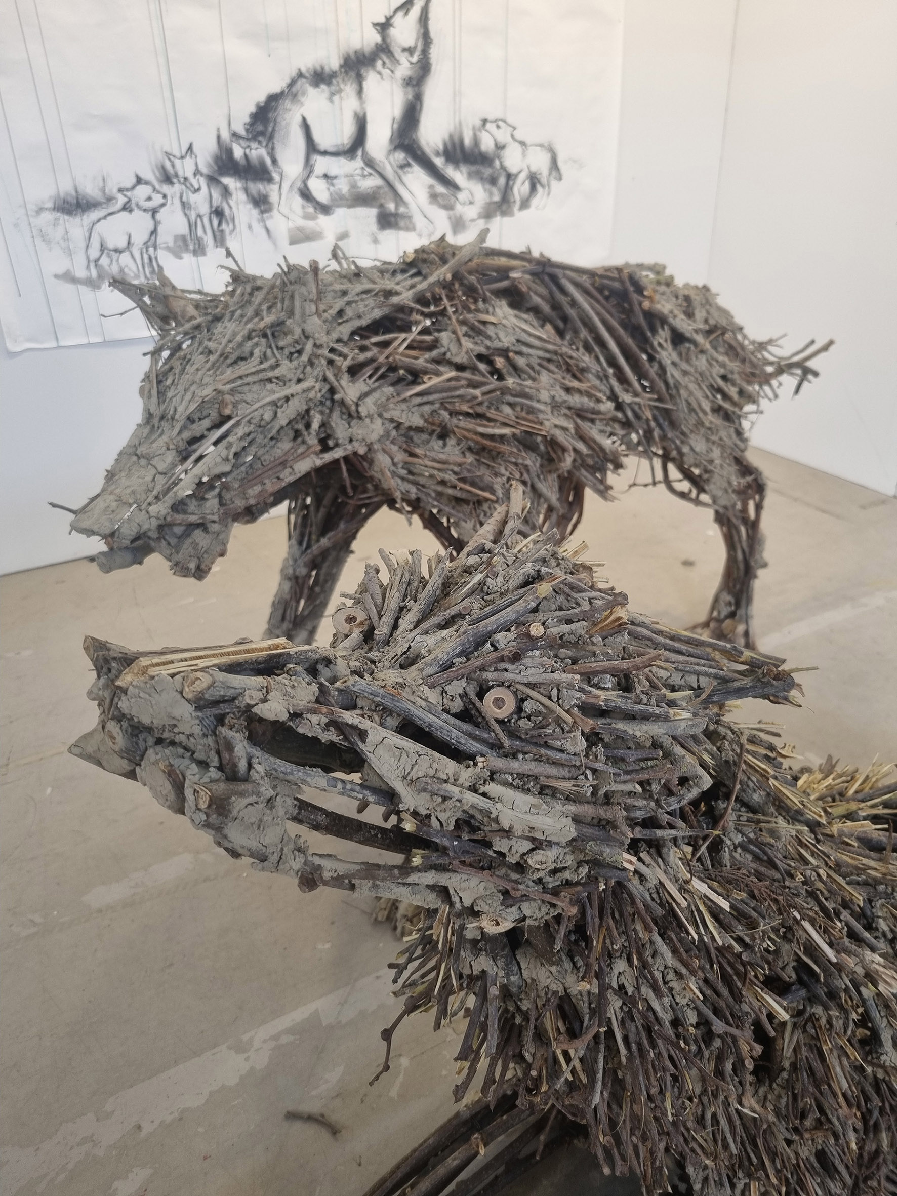 Elizaveta Sineva, (Astrakhan - Russia, 1999) a nove anni si è trasferita in Italia e attualmente vive a Bagnacavallo (RA). Le sue sculture sono realizzate interamente con materiali naturali, raccolti in armonia con l’ambiente circostante. Fango e argilla, provenienti direttamente dal fiume, mentre i rami utilizzati provengono esclusivamente da potature riciclate, messe a disposizione dai contadini locali. Nessun albero è stato abbattuto appositamente per la creazione delle sculture, enfatizzando così il profondo rispetto per la natura che le sue opere intendono trasmettere. Ogni elemento utilizzato è frutto di una raccolta etica e delicata, senza causare alcun danno all’ecosistema. Le sue creazioni incarnano un dialogo tra arte e natura, celebrando l’equilibrio e la sostenibilità, evidenziando che l’arte può fiorire senza violare il mondo naturale. La ricerca artistica della giovane artista esplora la relazione tra l’uomo e la natura, con particolare attenzione alla famiglia e alla percezione di superiorità dell’uomo sugli altri animali. Fin da piccola Elizaveta è stata affascinata dai lupi, prima per aspetto e movenza, poi per la forte coesione del branco, che riflette la struttura famigliare umana. Inoltre nonostante i numerosi stereotipi e la paura che gravita attorno a questo animale, l’artista sostiene che è in realtà il lupo ad avere paura dell’uomo.