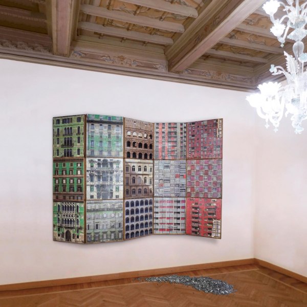 Nell’immagine: "Vessillo per abitanti eroici" 2017 - stampa fotografica su collage di pagine di libri d'epoca, cassetti tipografici, caratteri mobili in piombo - cm. 165 x 220 x 20