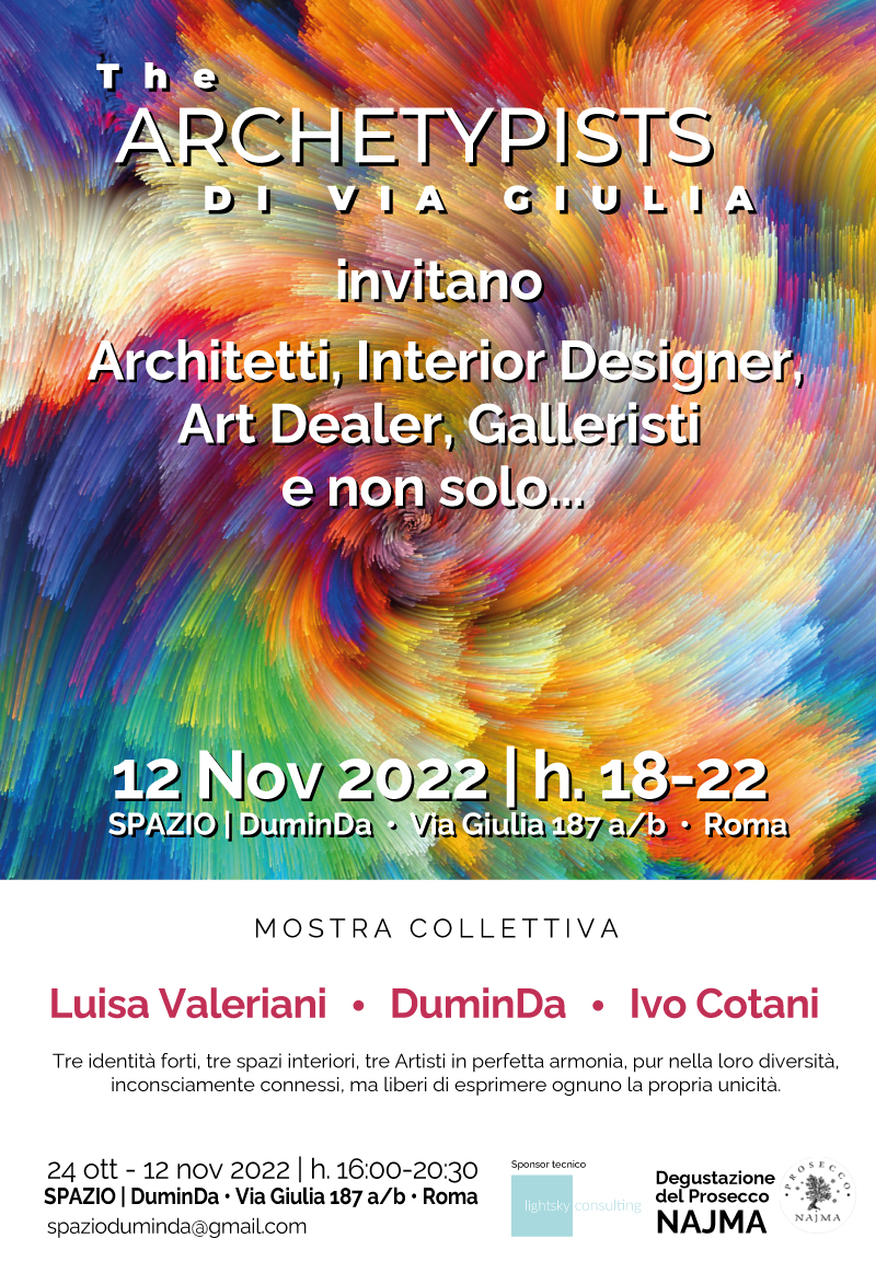 Il Collettivo The Archetypists di via Giulia - Luisa Valeriani la MAGA, DuminDa l’INNOCENTE, Ivo Cotani l’INNAMORATO -, protagonista del progetto/mostra “Il Gioco degli Archetipi, Act One” curato da Sara Corti e inaugurato durante Rome Art Week presso Spazio DuminDa, uno spazio d’artista condiviso, invita architetti, interior designer, art dealer, gallerie e non solo, il 12 novembre 2022 dalle ore 18:00 alle 22:00, per presentare la propria ricerca artistica con l’auspicio di creare nuove sinergie, interazioni e future collaborazioni.