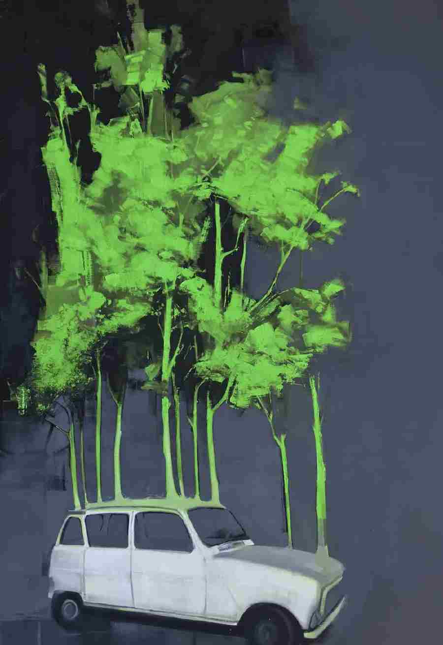 Un corpus di 16 opere di cui 13 oli su tela, tavola e plexiglass, 2 grafiche e una scultura di grande formato. Tutto è scandito dal tempo e Gianluca Carbone costruisce un repertorio iconografico di simboli che gli consentono di dare una veste grafica a un’entità ontologicamente indeterminata. Ovunque, scheletri di architetture post atomiche, di un tempo e un luogo dove gli alberi crescono sul cemento e l’uomo abdica in favore della natura che lo fagocita. Resistono, tuttavia, alcune figure umane, rappresentazione di un modo di vivere il tempo: Bolt, l’atleta che sfida il tempo; il Bianconiglio che lo rincorre; perfino una versione dinamica, con tanto di scarpette al piede, del San Matteo di Caravaggio. L’artista passa con fluida naturalezza da un linguaggio creativo all’altro seguendo il filo rosso di una continua sperimentazione della materia. Nell’unica grande scultura in mostra, il legno, il metallo e la schiuma espansa si fondono in una composizione resa compatta dalla finitura con una speciale carta pesta, macerata per giorni, frullata e resinata. Nei dipinti, il colore umido scivola in superficie lasciando poco spazio all’aggetto e la selezione cromatica è ridotta ai minimi termini. Qui l’artista adopera diversi materiali di supporto, passando dalla classica tela, al legno fino all’impiego del plexiglass che restituisce ai lavori un’intensa luminosità autoportante.