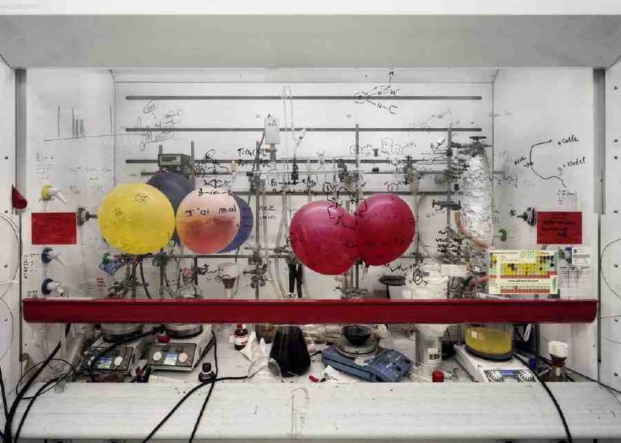 Laboratori di ricerca spaziale, impianti nucleari, sale operatorie, piattaforme di perforazione sono fotografati con minuziosa attenzione, distaccata curiosità e con la capacità di osservare quelle caratteristiche degli ambienti e delle infrastrutture che i ricercatori non vedono più, perché estranee ai loro interessi. Come nell’immagine della cappa chimica dell’Università di Edimburgo che può sembrare, a un primo sguardo, una sala allestita per una festa di bambini tra scritte sul vetro e palloncini colorati. La tecnologia è completamente visibile, ma la funzione effettiva che svolge rimane nascosta.