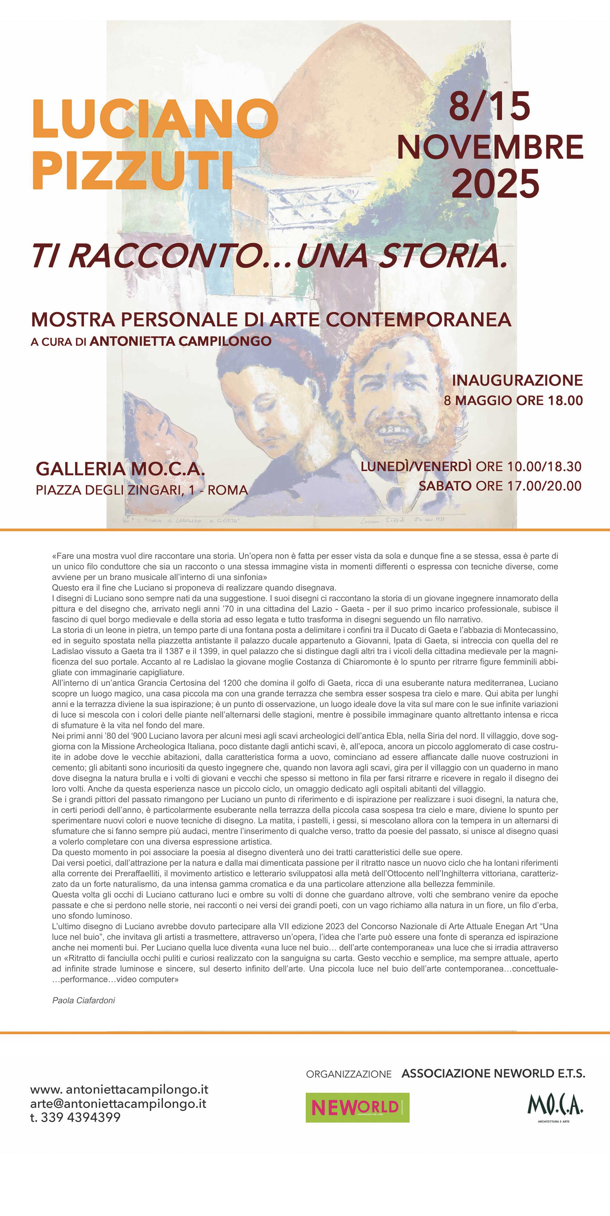 Sabato 8 novembre alle ore 18.00 si inaugura, presso la Galleria Mo.C.A. – Piazza degli Zingari, 1 – Roma, la Mostra Personale di Luciano Pizzuto dal titolo: Ti racconto…una storia.  L’evento è a cura di Antonietta Campilongo con l’organizzazione dell’Associazione Neworld E.T.S.