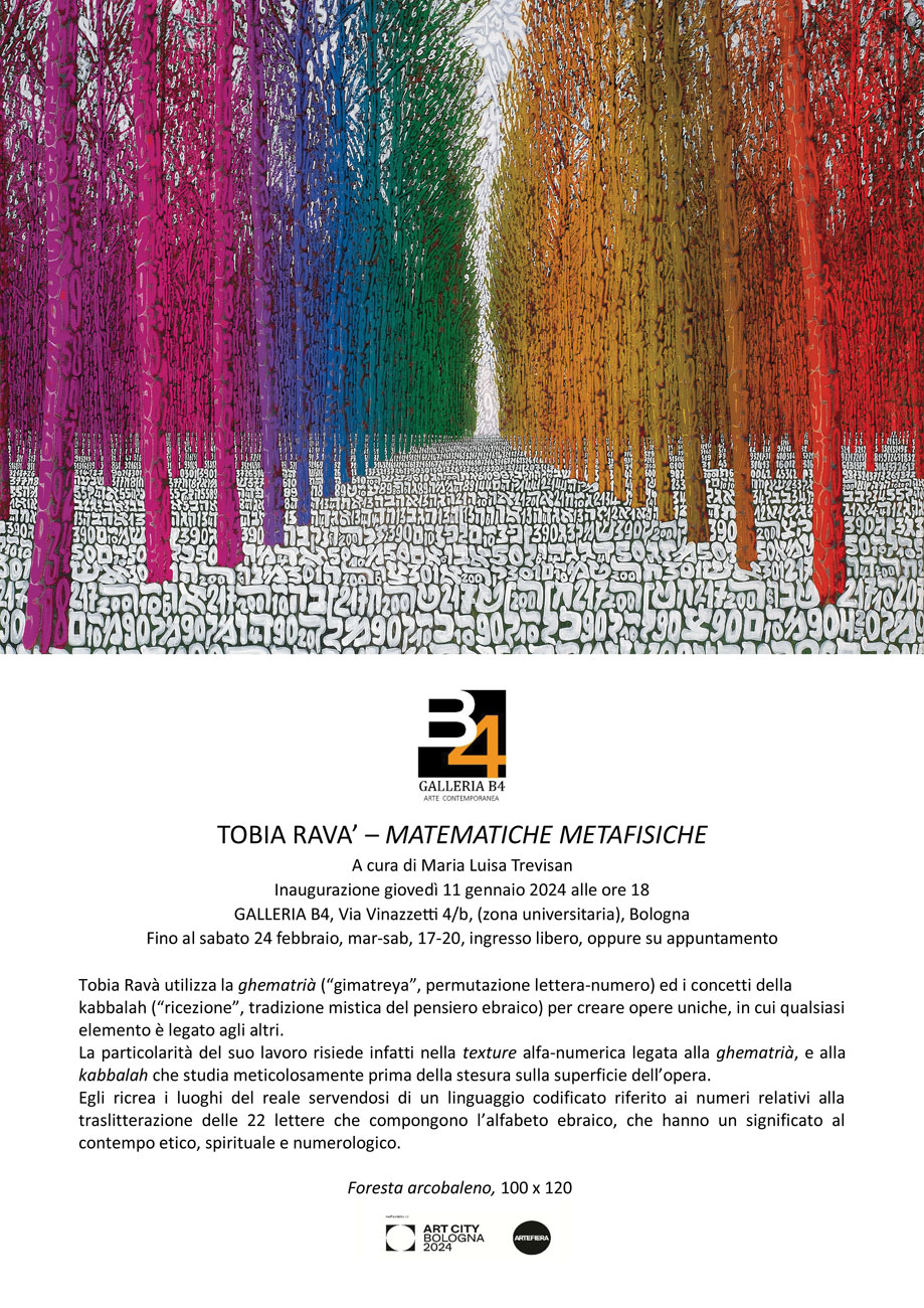 Tobia Ravà utilizza la ghematrià (“gimatreya”, permutazione lettera-numero) ed i concetti della kabbalah (“ricezione”, tradizione mistica del pensiero ebraico), in cui qualsiasi elemento è legato agli altri. La particolarità del suo lavoro risiede infatti nella texture alfa-numerica legata alla ghematrià, e alla kabbalah che studia meticolosamente prima della stesura sulla superficie dell’opera. Egli ricrea i luoghi del reale servendosi di un linguaggio codificato riferito ai numeri relativi alla traslitterazione delle 22 lettere che compongono l’alfabeto ebraico, che hanno un significato al contempo etico, spirituale e numerologico.
