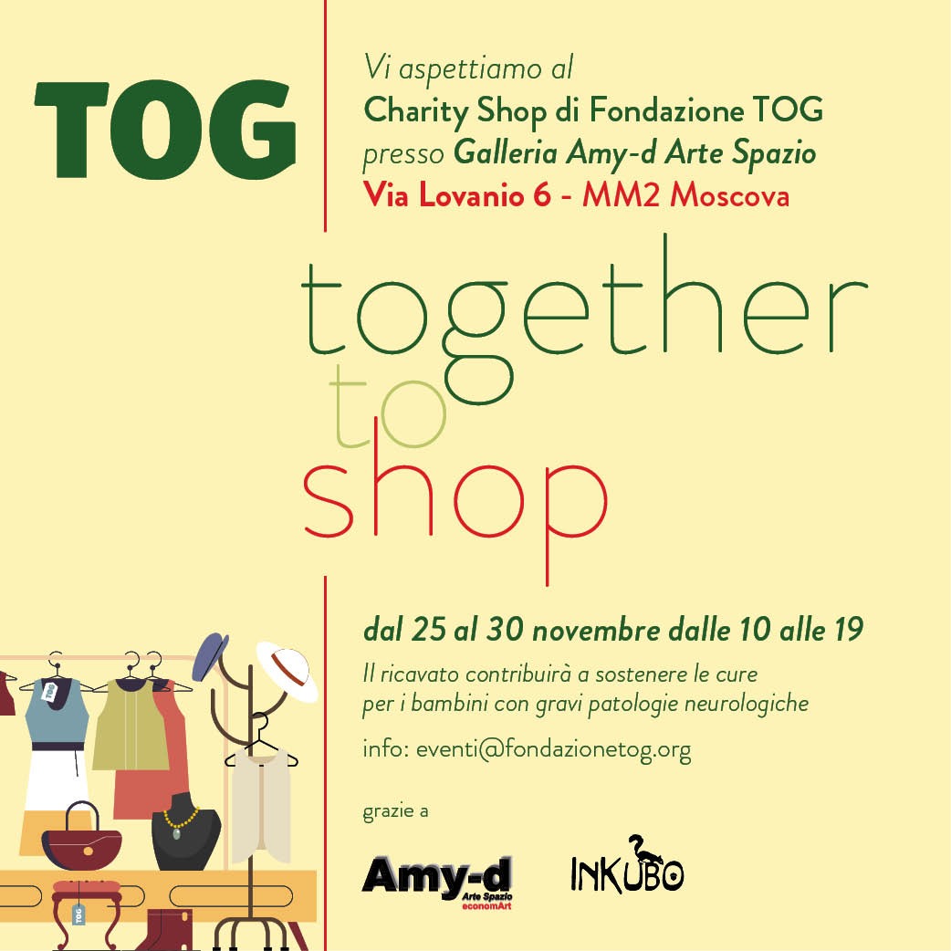 La galleria di ricerca milanese Amy d Arte Spazio e il Brera District sono lieti di ospitare la Fondazione TOG Together To Go per un charity shop il cui ricavato contribuirà al sostegno di cure per bambini con gravi patologie neurologiche .