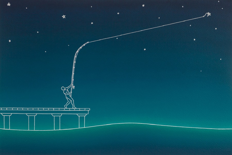 In esposizione una serie di recenti dipinti a olio e china su carta: sintetici lavori dal taglio narrativo, nei quali è raffigurato un minuscolo individuo - inconfondibile protagonista delle opere di Taddei - che conduce una paradossale esistenza, sospesa proprio tra cielo e mare. L’artista propone una lettura metaforica della condizione umana, sdrammatizzando, con sottile ironia, il senso di vuoto e di caducità che l’uomo può provare di fronte al proprio destino.