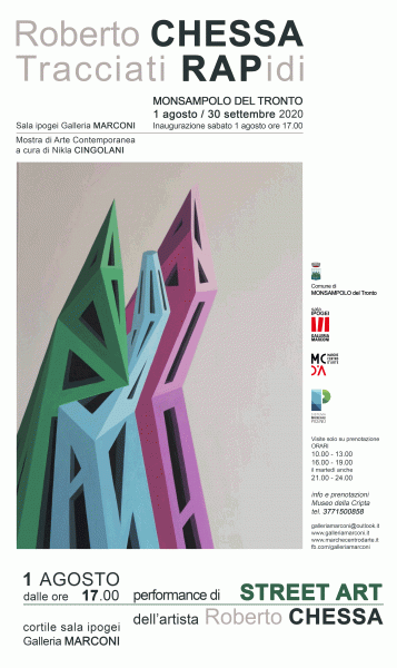 A Monsampolo del Tronto riparte l’Arte contemporanea. Sabato 1° agosto 2020 alle 17.00, Sala Ipogei “Galleria Marconi” propone “Tracciati RAPidi”, mostra personale di Roberto Chessa. La mostra, a cura di Nikla Cingolani, è organizzata dal Comune di Monsampolo del Tronto da Galleria Marconi e da Marche Centro d'Arte.