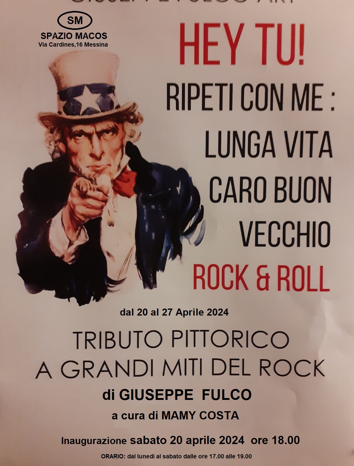 Sabato 20 aprile, alle ore 18.00, a Spazio Macos, Via Cardines, 16, si inaugura la Mostra Personale di Giuseppe Fulco dal titolo “Tributo pittorico a grandi miti del Rock, curata e presentata dalla d.ssa Mamy Costa che spiega: “Nei lavori di Giuseppe Fulco, artista messinese, è appropriato l’uso dell’appellativo pop, con tutti i distinguo del caso; perché è un’arte che si apre spesso e volentieri ad una delle forme più popolari di comunicazione contemporanea, ovvero la musica; perché della musica ritrae alcune icone assolutamente popolari, personaggi in taluni casi che ne hanno fatto la storia. E perché – spostando ora il termine “pop” totalmente in ambito musicale – della pop-music si accosta al genere probabilmente più popolare, trasversale, alternativo, “sociale” in assoluto, ovvero il rock. Pop art and rock , appunto, ma anche immagini che possono andare oltre questa precipua peculiarità, slegandosi dal mero interesse dei soggetti ritratti per cogliere, nel senso, il messaggio primigenio della pop art, ovvero un’arte di massa, riconoscibile, iconografica e identificabile, certamente ben legata al tempo nel quale si genera e del quale vuole raccontare qualcosa, quasi con nostalgia.”