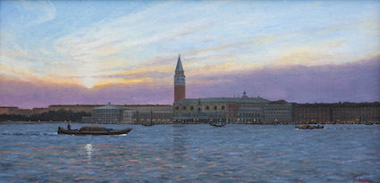Equilibrio e sensibilità caratterizzano i suoi dipinti, nei quali il pittore sa legare molto armoniosamente il linguaggio del passato con le esigenze di linearità di quello moderno. Ne escono - conclude Accerboni - delle vedute marine che poggiano la loro veridicità sulla storia e sulla luce e in cui le antiche e raffinate architetture si fondono con un cielo e un mare intensamente azzurri, che riflettono e suggeriscono, sempre mediante la luce, un senso di pace e atarassia, che appare anche nei dipinti dedicati alla laguna.