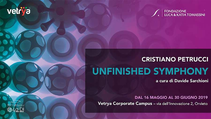 La Fondazione Luca e Katia Tomassini presenta “Unfinished Symphony”, il nuovo progetto di Cristiano Petrucci (Roma, 1974) che per la prima volta sperimenta un lavoro site-specific incentrato sull'interazione tra forme plastiche, luce e suono, con l'intento di edificare un'inedita dimensione spaziale, percettiva e sensoriale. L'artista ha escogitato un complesso sistema coreutico costituito da diversi elementi plastici e formali organizzati coerentemente per gruppi e disposti nello spazio espositivo secondo precisi criteri estetici e compositivi. Ciascun elemento è retroilluminato da un led, le cui variazioni cromatiche sono sincronizzate ai temi di una composizione sonora inedita creata per l'occasione da Michele Papa e che si ispira alla celebre “Incompiuta” (Sinfonia n° 8) di Franz Schubert. L'opera, nel suo insieme, produce un movimento continuo, ipnotico e uno scambio reciproco tra soggetti e oggetti di percezione, con rimandi formali tra i singoli elementi, assecondando un tempo di fruizione circolare senza dover avere la necessità di individuare un inizio e una fine. L'intento è quello di proporre una mostra intesa come un unico e articolato grande lavoro che suggerisca l'idea di “opera d'arte totale” in grado di coinvolgere attivamente lo spettatore sotto ogni aspetto.